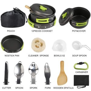 - 【12 PCS Camping Cookware Set】The stainless camping cookware set include 1*nonstick Pan , 1* Pot , 1*pot cover , 1* cleaner , 2*bowl , 1* soup spoon , 1*cutter , 1*Spoon , 1*Sfork , 1*fork , 1*wooden spatula,1*carabiner 1 carry bag.